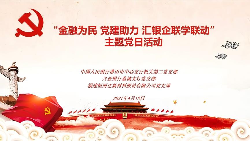 为隆重纪念中国共产党成立100周年,回顾党的光辉历史、缅怀革命先辈丰功伟绩,共学辉煌党史,加强党建引领,促进党建与企业融合,发挥党员干部先锋模范作用,激励党员干部增强责任意识,4月13日下午,福建恒而达新材料股份有限公司党支部联合人民银行莆田市中心支行机关第二党支部和兴业银行荔城支行党支部,开展庆祝建党100周年暨“金融为民 党建助力 汇银企联学联动”主题党建活动。