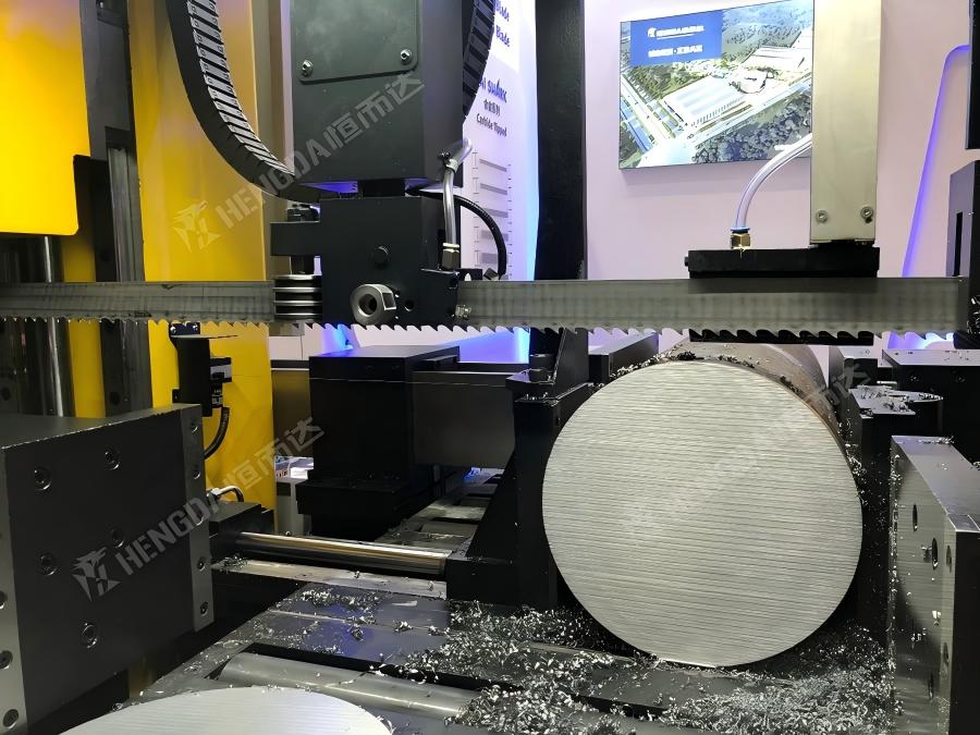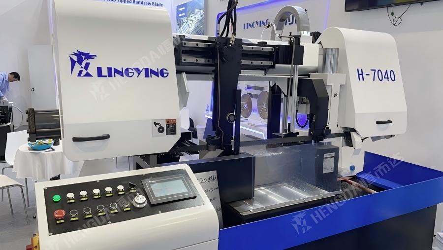 本次展品中,首次亮相展会的卧式高速带锯床(H-6045NC型号),是搭配磨齿带锯条和硬质合金带锯条产品锯切金属材料的智能数控装备,采用PLC可编程序电气控制系统,并且加入了创新性智能锯切系统,可通过系统选择的锯切材料种类,锯床可以自动完成锯切速度、锯切线速度等锯切参数的调整,以达到最佳的锯切效率并大大提高带锯条的使用寿命。带锯床的工作动作通过PLC显示屏操作,有数字显示,并可通过显示屏直接完成自动或手动控制模式切换。