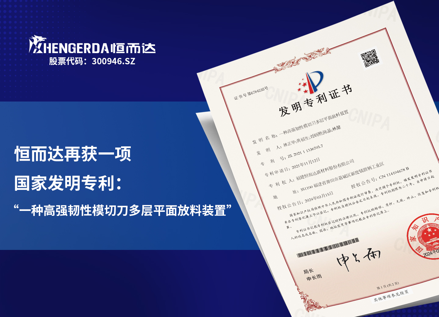 喜讯丨恒而达一种高强韧性模切刀多层平面放料装置荣获一项国家发明专利!